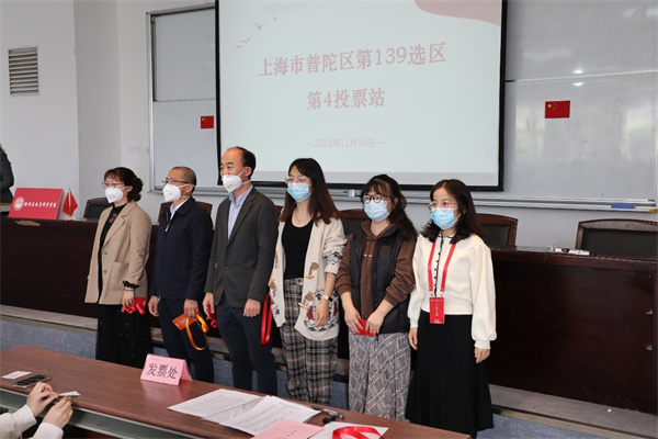 学院党委书记李恺主持普陀区第139选区第4投票站会议。投票站严格按照要求,悬挂国旗、会标,张贴书写投票选举的注意事项。在清点选民人数,通过总监票人、监票人、计票人名单后,工作人员依次分发选票、选民按照注意事项要求写票,并按照规定的路线投票,秩序井然。在全院教工的共同努力下,我院投票站选民参选率达100%,选票100%有效,最终选举结果将在普陀、闵行区选举办批复后正式公布。