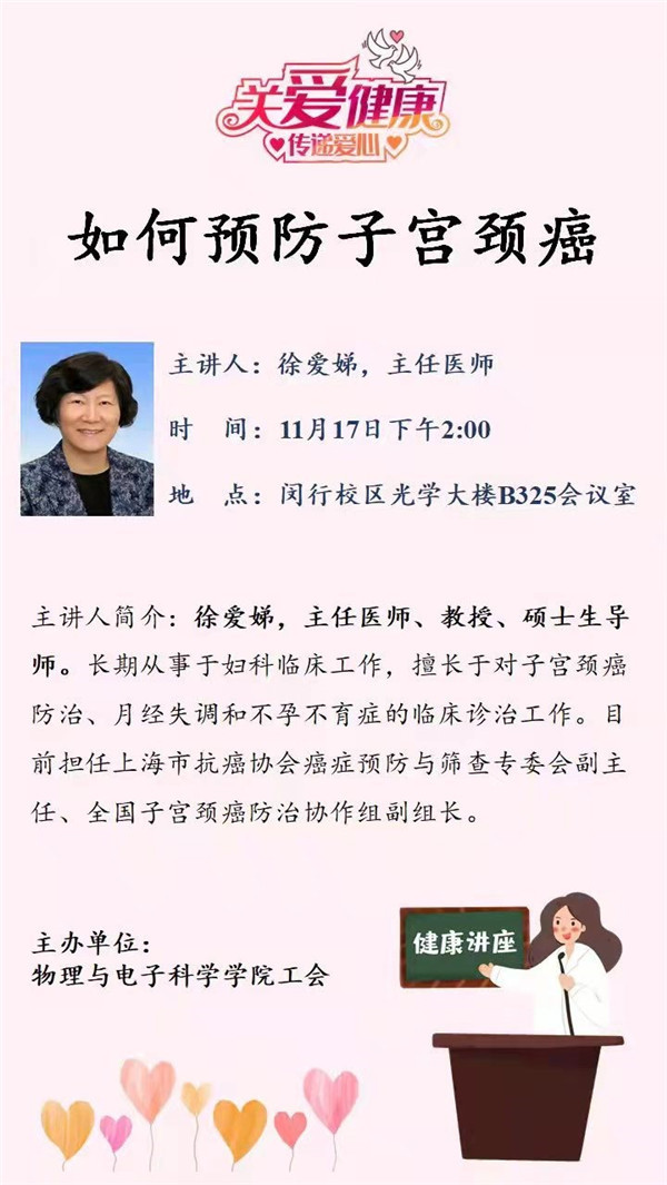 为关爱女教工身体健康,科普健康知识,进一步提高大家的自我保健意识,11月17日下午,买球的app排行榜前十名推荐工会妇女工作组邀请复旦大学妇产科医院主任医师、全国子宫颈癌防治协作组副组长、上海市抗癌协会癌症预防与筛查专委会副组长徐爱娣医生,来我校开展健康讲座与咨询活动,活动在光学大楼会议室举行