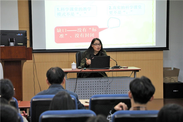 随后,赵老师以“明松暗紧”“主次分明”“四多一少”“形残质全”等关键词概括了美国在课堂教学管理、师生角色、教学方法、教学结构等方面的特点,她举例解释了每个缩写词背后的深刻含义。赵老师同时强调,要重视实施“以人为本”和“科学本质”的教学,还和在场学生讨论了对于科学本质的看法。
