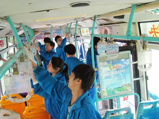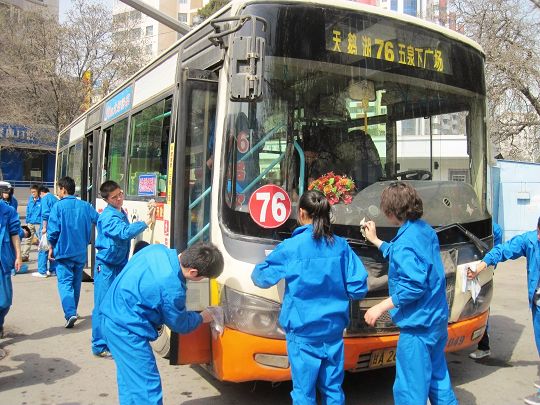 76路公交车站负责人对同学们的到来表示了热烈欢迎并向同学们就工作任务作了大致说明。青年志愿者们经过简单的分组后对停放的76路公交车进行了内部清洗。大家有的负责擦洗车窗玻璃,有的负责车厢地板的清扫,有的负责车门以及扶手的清洁,有的对每个塑料座椅及靠背进行了认真的擦拭。志愿者们高涨的热情、高效率的劳动确保了每一辆驶入车站的公交车都能及时得到清洁,每一辆驶出的车辆都干净整洁。看到窗明车净,驾驶员们对现场的志愿者们竖起大拇指,经常乘坐76路车的乘客也称赞今天的车格外干净,一上车就觉得特别舒服。