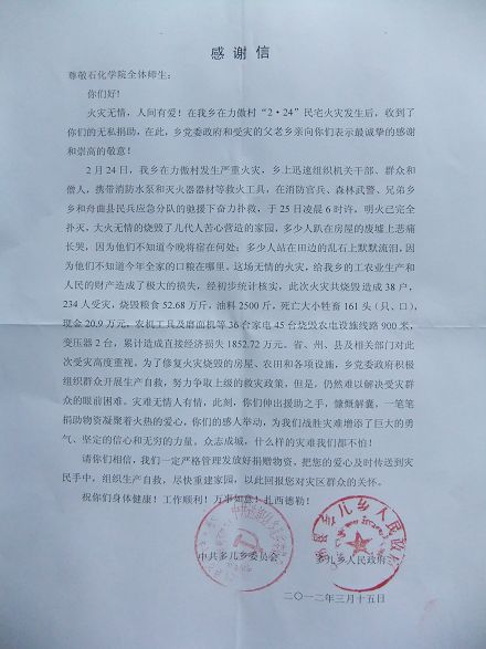 当我们安然有序地学习工作、安康幸福地享受生活时,一场灾难降临到了我们甘南藏族自治州的藏族同胞身边!2月24日,位于偏远藏区的甘南州迭部县多儿乡在力傲村发生一起严重民宅火灾,大火无情地烧毁了几代人苦心营造的家园,致使全村45户256人中38户231人受灾,造成直接经济损失1852.72万元。本次灾害涉及面广,损失惨重,多少人趴在房屋的废墟上悲痛长哭,因为他们不知道将宿在何处;多少人站在田边的乱石上默默流泪,因为他们不知道今年全家的口粮在哪里。面对十分严重的灾情,我院师生大力发扬中华民族“一方有难,八方支援”的优良传统,向受灾群众伸出热情援助之手,学院捐助价值10000元的被褥,广大师生员工积极捐助善款13424.70元,衣物2000余件,为他们重建家园提供些许帮助,让我们的同胞感觉到祖国大家庭的温暖。