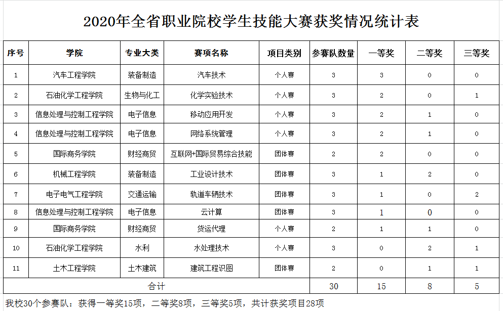 本次比赛,在学校的大力支持和各二级学院的精心布置下,自2020年开始,经过近半年时间的精心准备、认真培训,最终获得了省赛的好成绩并取得了至少六个赛项的国赛参赛资格。通过竞赛,提高了教师的专业能力和学生的实践创新能力,为更好地培养技术技能型人才起到了积极促进作用。