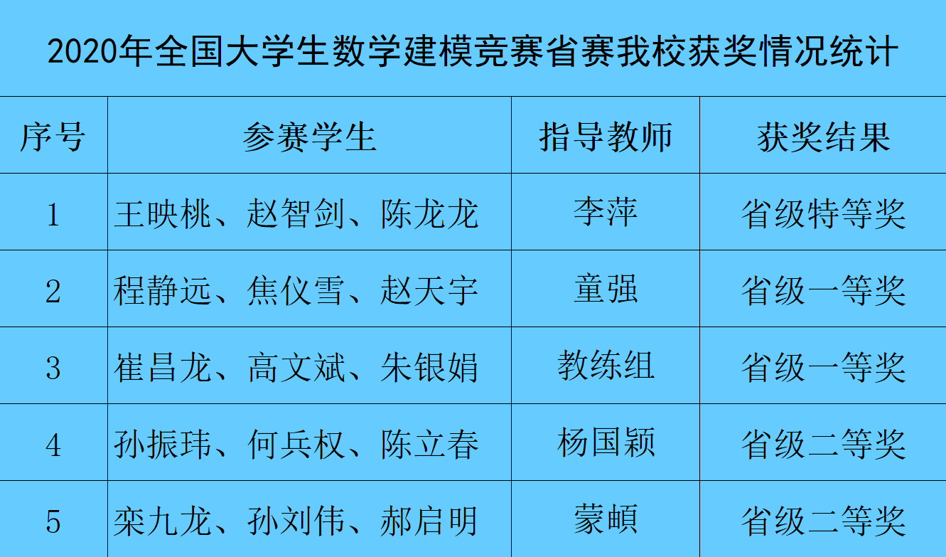 近日,由教育部高等教育司和中国工业与应用数学学会共同主办的2020年“高教社杯”全国大学生数学建模竞赛(省赛)获奖结果公布。由信息处理与控制工程学院牵头组建的威尼斯代表队参加了该项竞赛,经过激烈角逐,最终威尼斯代表队荣获省级特等奖1项,一等奖2项,二等奖2项。