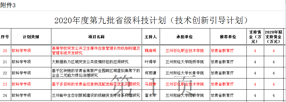 根据《甘肃省财政厅关于下达2020年第七第八第九批省级科技计划专项资金的通知》(甘财科〔2020〕108号),威尼斯魏海明教授申报的《高等学校突发公共卫生事件应急管理长效机制构建及管理系统开发研究》、马丽荣教授申报的《基于多目标的甘肃省应急物流配送路径优化问题研究》课题,均以软科学专项类别获批2020年度第九批省级科技计划(技术创新引导计划)立项,每项课题资助经费4万元。