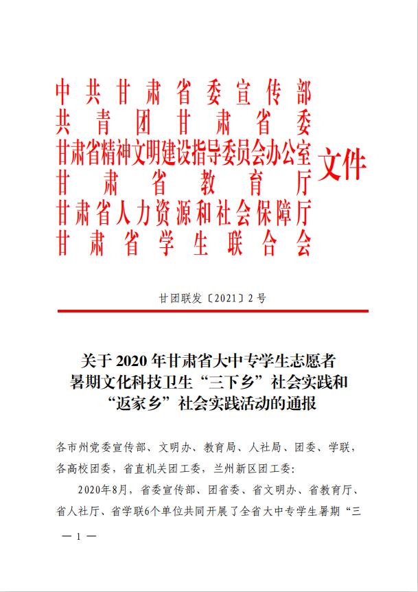 近日,省委宣传部、团省委等6家省级单位联合发文,下发了(甘团联发〔2021〕2 号)《关于 2020 年甘肃省大中专学生志愿者暑期文化科技卫生“三下乡”社会实践和“返家乡”社会实践活动的通报》。学校获得“优秀单位”荣誉称号(连续2年荣获);2支团队获得“优秀团队”荣誉称号;2支团队获得“青春心向党 奋力建小康”精神扶贫专项社会实践活动“优秀团队”荣誉称号;3名教师获得“优秀工作者”荣誉称号;3名学生获得“优秀个人”荣誉称号。其中,学校团委2019年、2020年连续荣获“优秀单位”荣誉称号;机械工程学院“决战脱贫攻坚”实践队、国际教育学院陇南宕昌县哈达铺 “牵手希望,践行使命,筑梦起航”服务团荣获“优秀团队”荣誉称号;学校赴张家川县榆树村、连柯村精神扶贫专项社会实践小分队、国际商务学院赴甘南精神扶贫专项社会实践小分队荣获“青春心向党 奋力建小康”精神扶贫专项社会实践活动“优秀团队”荣誉称号;王靖基、丑岩桦、左婧文3名教师荣获“优秀工作者”荣誉称号;郭惠文、杨晓晨、司杰3名同学荣获“优秀个人”荣誉称号。