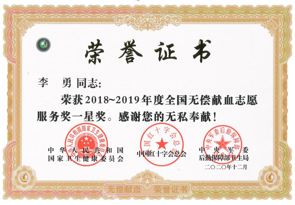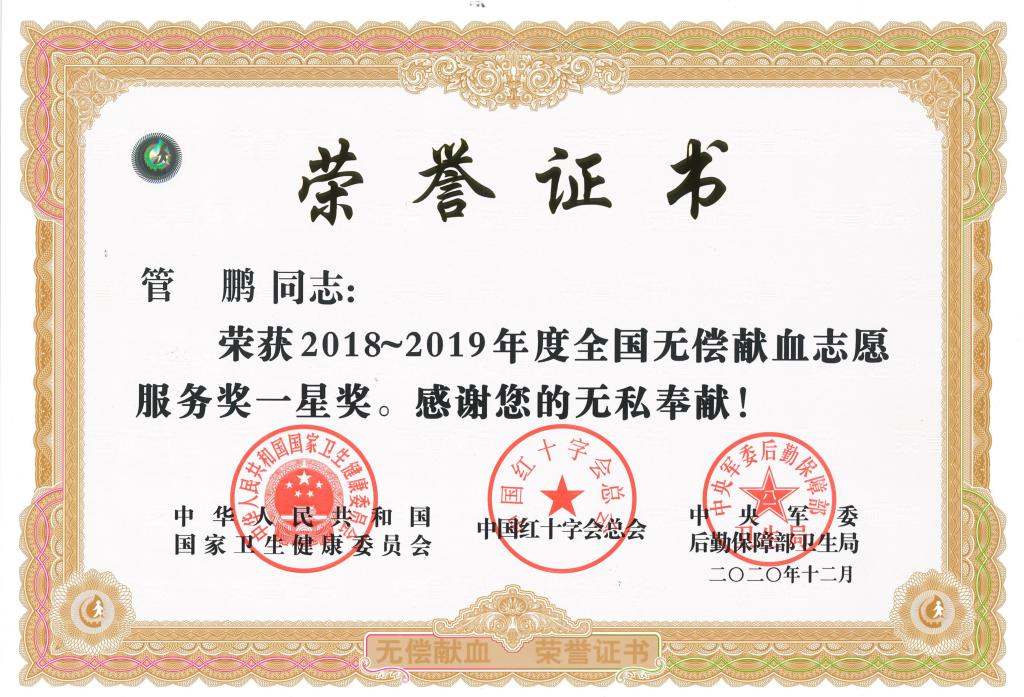 近日,国家卫生健康委员会、中国红十字会总会、中央军委后勤保障部卫生局联合组织召开2018-2019年度全国无偿献血表彰电视电话会议,会议表彰了无偿献血先进集体和个人。机械工程学院王凯、李勇、管鹏三名同学荣获2018-2019年度全国无偿献血志愿服务一星奖。