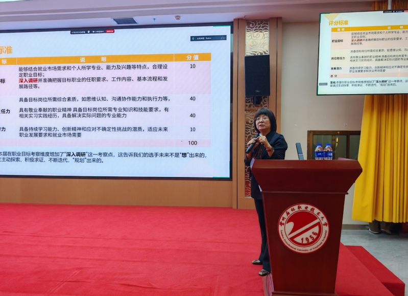会议特邀职业规划大赛资深专家李竹梅教授进行指导。她围绕第三届大赛的最新文件精神、评审标准、赛道设置以及核心考查维度进行了系统而深入的剖析,并结合历年国赛、省赛的优秀案例,为在场教师提供了极具针对性的备赛策略与指导建议。其高屋建瓴的解读,帮助老师们准确把握了大赛导向,厘清了指导思路。