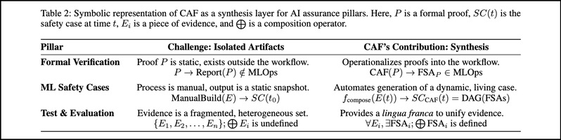 论文认为现代人工智能系统的复杂性不断提升,暴露出一个显著的安全保障缺口:来自红队测试、鲁棒性测试等实践的安全证据依然是碎片化的,缺乏贯穿整个开发生命周期的形式化组合与传播机制。这阻碍了严谨且动态的安全论证体系(safety case)的构建,而这正是实现可信 AI 的关键。论文提出了可组合保障框架(Composable Assurance Framework,CAF),是一种将安全保障直接嵌入 MLOps 工作流程的全新工程方法。其核心概念是形式化安全断言(Formal Safety Assertion, FSA,其形式化方法详见表格),这是一种标准化、机器可读的结构,能够可验证地关联安全属性(如鲁棒性评分或无欺骗性电路)与特定的 AI 工件(artifacts)。最后论文定义了一个组合演算(Composition Calculus),即一组形式化规则,用于描述当系统由多个组件组合而成时,FSA 如何被传播与聚合。