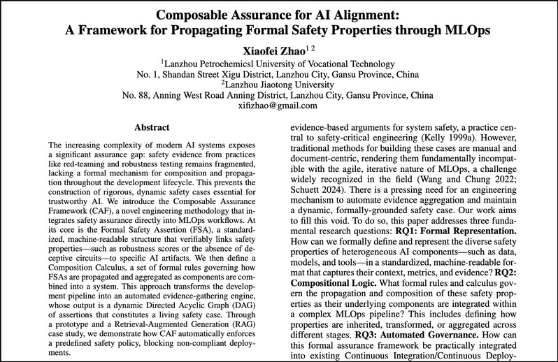 近日,学校信息工程学院教师赵晓菲的研究成果论文“Composable Assurance for AI Alignment: A Framework for Propagating Formal Safety Properties through MLOps”被国际人工智能顶会(AAAI 2026)长文全文录用为Oral Presentation。