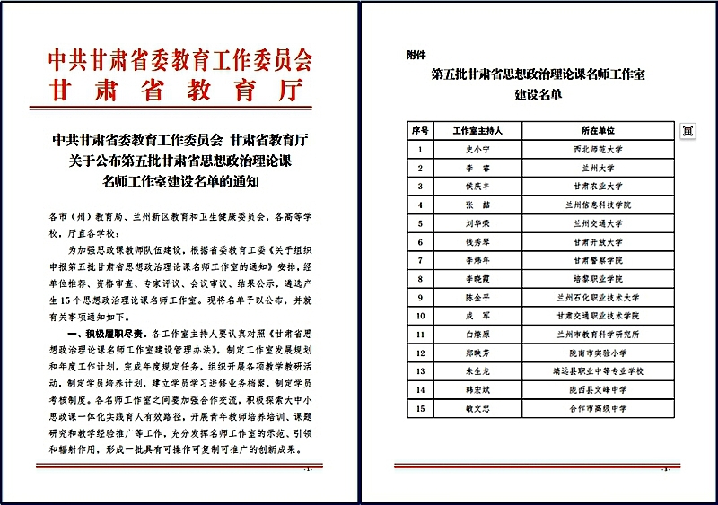 根据省委教育工委《关于组织申报第五批甘肃省思想政治理论课名师工作室的通知》有关安排,经经学校推荐、资格审查、专家评议、会议审议及结果公示等程序,全省大中小学共有15个团队入选“第五批甘肃省思想政治理论课名师工作室”建设单位。其中,威尼斯陈金平副教授领衔的团队成功获批,成为本批次省级思政课名师工作室建设单位之一。