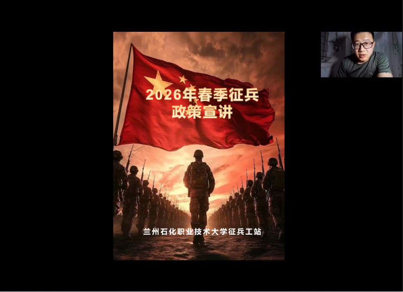 1月14日晚,应用化学工程学院通过线上钉钉直播平台成功举办了2026年春季征兵政策宣讲会。这是学院继春季征兵动员后,面向全院在校生特别是应届毕业生开展的又一次精准动员。学校征兵工作站负责人、国防教育科王琦老师应邀担任主讲,全体辅导员、班主任及300余名学生在线参与。