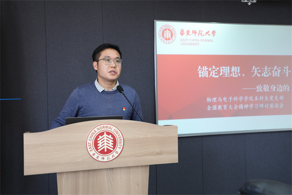 支部党员代表2021级电子信息科学与技术专业本科生傅旭杰、2020级物理学(优师计划)专业本科生陈昊、2021级物理学(师范)专业本科生张桓就学习、科研、生涯规划等进行发言交流,将从自身做起,从点滴做起,为教育强国贡献自己力量。