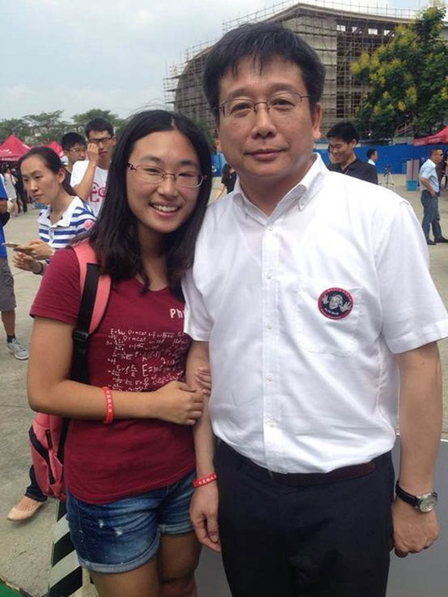 带上物理系特色徽章手环的陈校长与迎新志愿者的合影