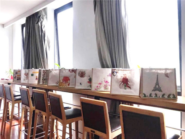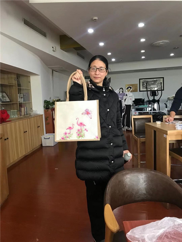 经过两个小时的制作,一件件生动的作品在欢声笑语中呈现出来。包的图案主要有花鸟、人物、景观、动物等不同系列。有的老师制作出“小黄人”系列图案;有的老师制作了“高定限量款”包包。大家互相讨论着自己的创意、配色和心得,脸上洋溢着开心的笑容。