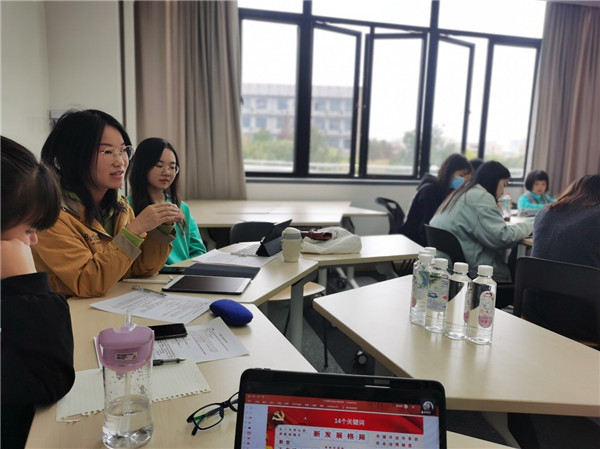 在分享环节,支部党员每人用四组词语表达了学习体会。支部党员童汉宇用“远大目标”“宏图”“创新”“自主自强”表达他希望未来能够参与科研创新、为实现科技自主自强这一远大目标奉献力量;支部党员陈倩倩用“高质量发展”“全方位规划”“可持续”“经济是重点”表达了要把新发展理念贯穿发展全过程和各领域,实现更高质量、更有效率、更加公平、更可持续、更为安全的发展理念的理解。