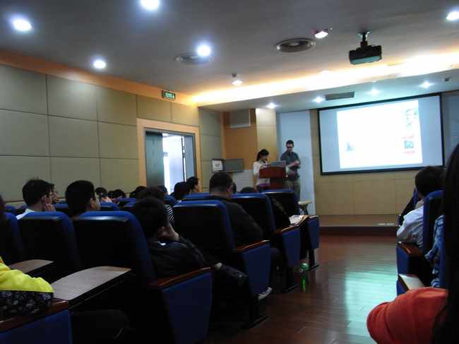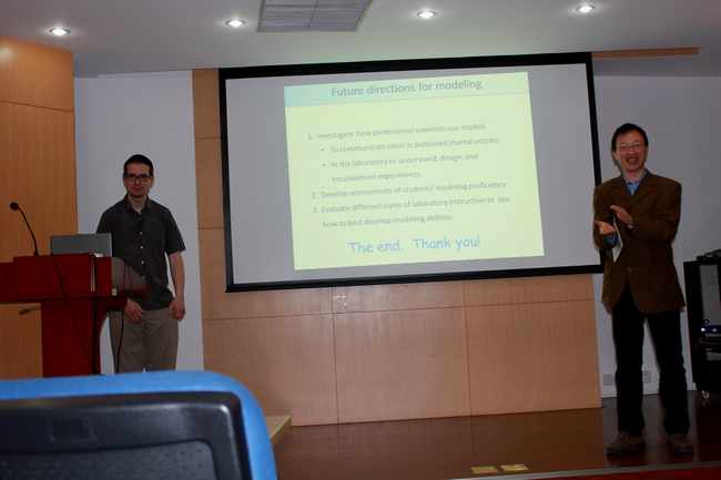 Zwickl 博士从他所进行的物理教学方面的工作开始讲起,主要介绍了构建合理的模型运用到物理教学中,并向大家说明了建模的检验和改进过程“科学研究过程需要不断地 建模及实验循环,这在物理实验教学中非常重要。” 还提出了将学生从课堂中拉出来,与科学家进行直接交流,或者直接进入实验室亲身参与实验的设想。讲座引起了同学们的广泛讨论和交流。最后,Zwickl 博士热情耐心地回答了同学们提出的一些问题。