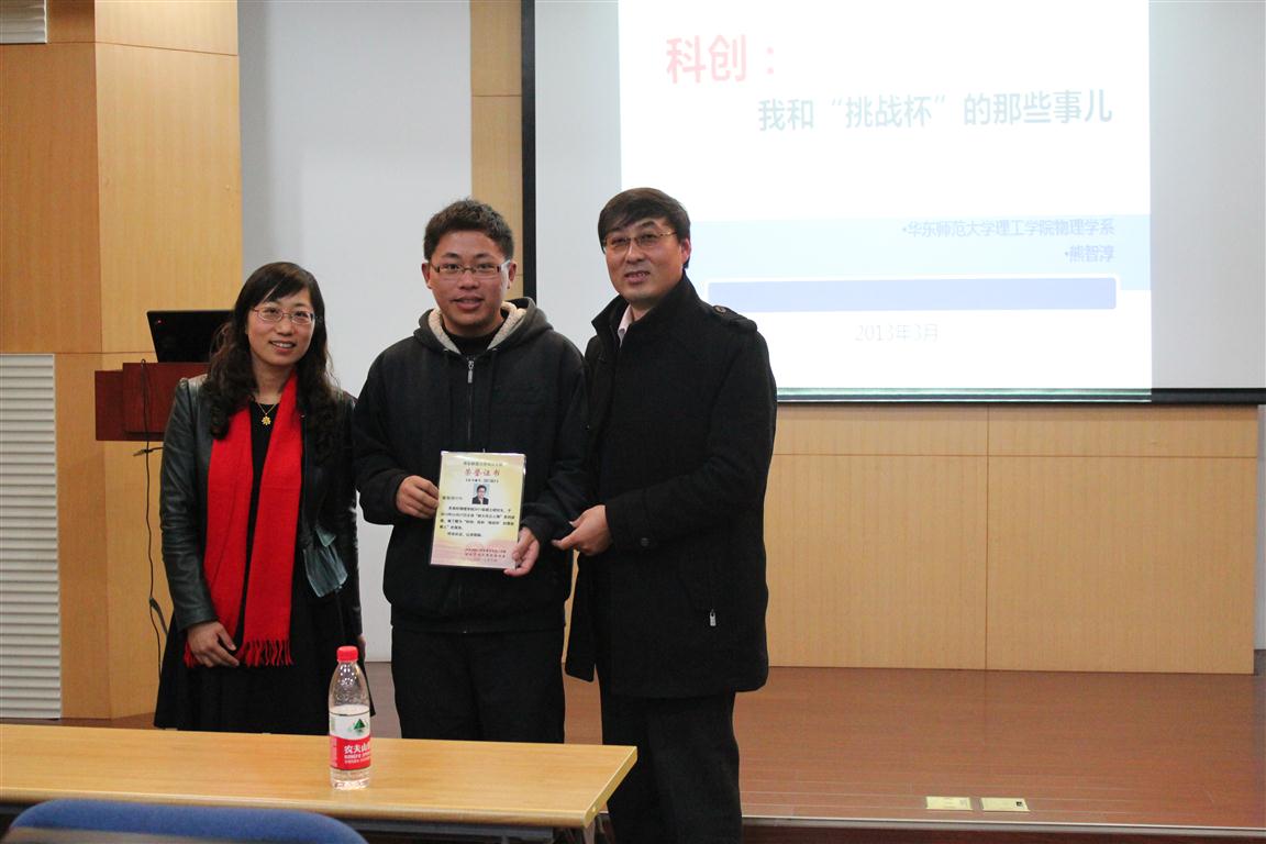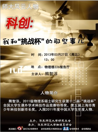 2013年3月27日下午13点,“师大风云人物”系列讲座——我和“挑战杯”的那些事,在物理楼226报告厅举行。校研究生院副院长兼研工部 部长刘敏老师、校研会主席唐婧琦莅临现场指导。物理系纳光电集成与先进装备教育部工程研究中心主任、终身教授、熊智淳同学的导师——孙卓老师作为点评嘉宾 出席了讲座,物理系党委副书记李燕老师主持了讲座。 熊智淳同学是物理系2011级硕士研究生,曾获十二届“挑战杯”全国大学生课外学术科技作品竞赛特等奖、第五届上海市青少年科技创新市长奖、2011年度 中国大学生年度人物入围奖、十大正规买球的app排行榜校长奖学金等奖项。