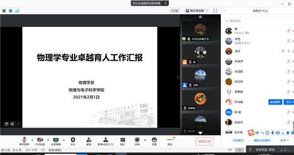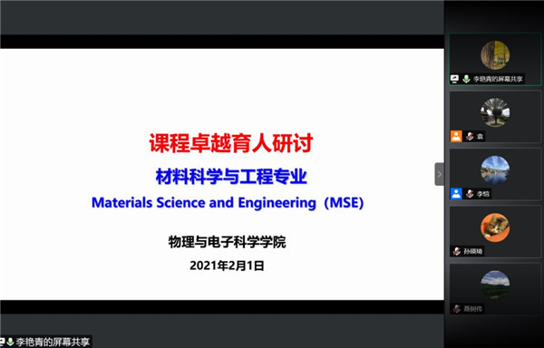 随后,学院四个本科专业的代表介绍了各专业推进卓越课程工作的情况。物理学系副系主任李欣从物理专业卓越育人的工作思路、培养方案修订策略、卓越课程建设工作、物理学拔尖人才培养方案等四个方面进行汇报;材料系副系主任李艳青汇报了材料专业卓越育人的定位、目标、举措、方案和进度安排;电子系副系主任彭晖就光电专业全育人培养方案的修订思路、课程设置、教材选用、养成教育方案、学习成效评估方法等方面进行汇报;电子信息科学与技术专业责任教授高建军分享了学习学校卓越育人相关文件的体会,介绍了电信专业课程卓越推进工作方案,他谈到,落实卓越育人不是喊口号,而是实事求是地解决课程、教师、教材、培养方案中的实际问题。