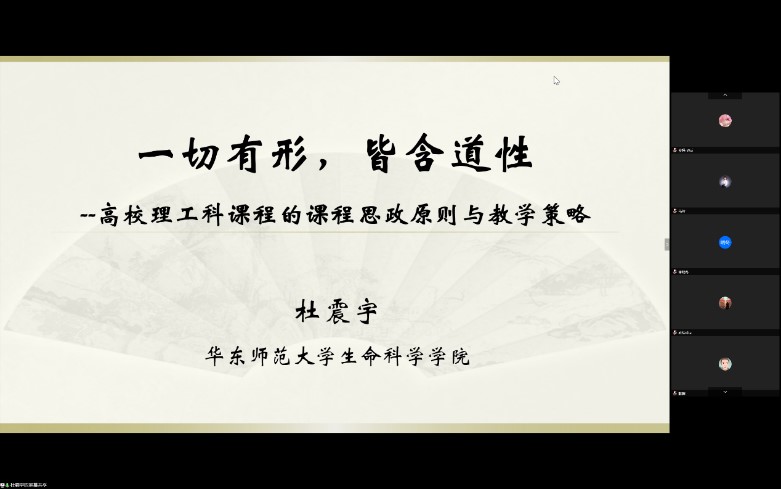 为进一步“用好课堂教学这个主渠道”,发挥理工科课程的思想政治教育功能,进而在全院形成三全育人的“大思政”格局,4月28日晚,由买球的app排行榜前十名推荐党委主办,物理实验教学中心教工党支部、物理系教工党支部、材料系教工党支部和电子系教工党支部联合承办的课程思政专题学习研讨会成功举办。生命科学学院杜震宇教授在线作《理工科课程思政教学原则与教学策略》专题报告,学院党委书记李恺,副院长周先荣、胡炳文,副书记蒋旭等近百位教师与会学习研讨。会议由物理实验教学中心教工党支部书记尹亚玲主持。