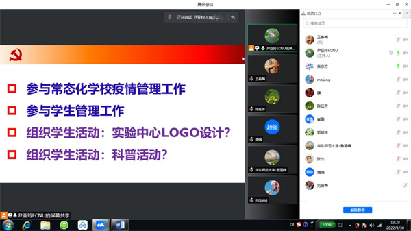 在近期重点工作讨论环节中,尹亚玲总结了近日实验中心参与学校疫情防控工作,特别是“组团式”关心学生的具体情况,介绍了中心党员赵强、崔璐、张杰等积极参加社区志愿者服务的事迹,并围绕“非常时期,如何发挥支部战斗堡垒作用,为师生做实事”展开讨论,集思广益。