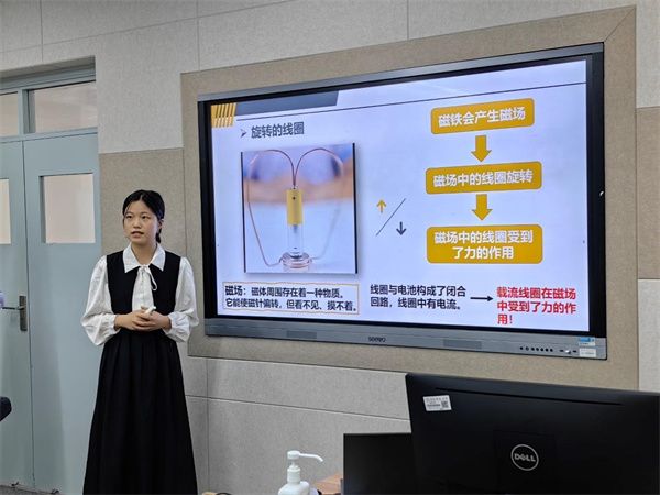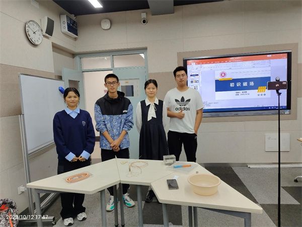 首讲示范课程《初识磁场》由2021级本科生陈佳妮主讲,2021级本科生陈潜,2023级本科生王玉青、时毅协助。陈佳妮以“小磁针”“旋转的线圈”“运动的电池”为主题,演示小实验,她以生活中的动物罗盘、磁悬浮列车为例,生动讲解了磁场的概念、作用,呈现了一堂丰富生动的科普示范课。