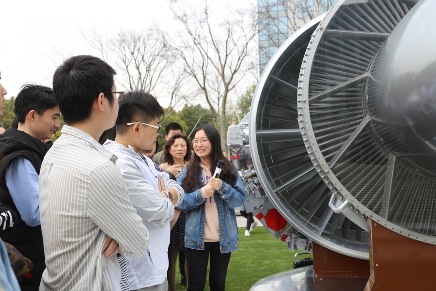 在公司团委副书记郭老师的带领下,师生们参观了公司园区,在办公大楼前摆放了大型飞机发动机模型,技术人员为同学们讲解飞机发动机的构造和原理,接着参观了位于办公大楼一楼的展厅,同学们都感到祖国航天事业的伟大。