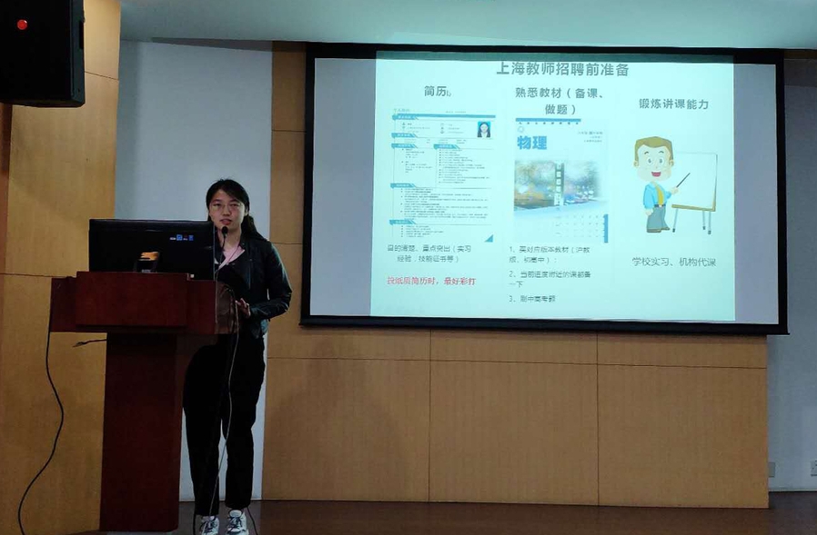 接下来就是正式经验交流会。第一位分享经验的是生物物理的鲁露,她签约了上海静安区的中学,耐心的讲述了上海教师招聘的一系列环节,无论是前期的充分准备,比如简历制作、教材熟悉、等,还是后续的教师招聘流程,像报名时间的关注、教师考试等,这些信息都为以后想留在上海工作的同学提供了宝贵的经验。