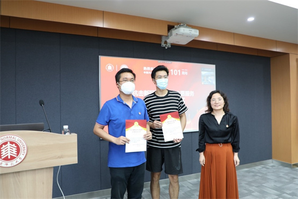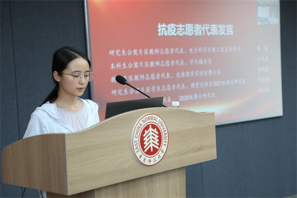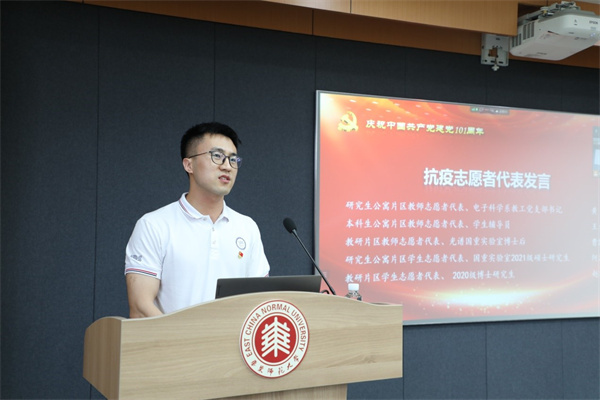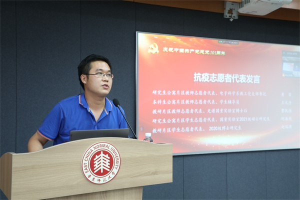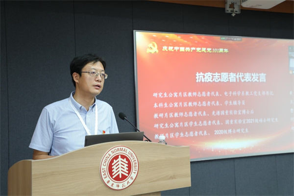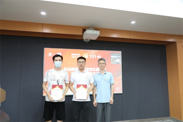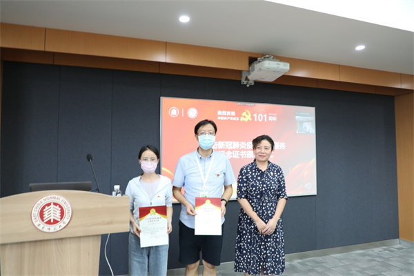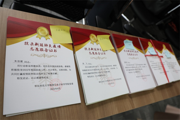 学院党委为346位师生志愿者制作了抗疫志愿服务纪念证书。会上,学院党委书记李恺,学院副院长、党委委员胡炳文,学院党委副书记、精密光谱国重实验室党总支书记、副主任郑利娟,分别为三个片区的志愿者代表颁发了证书。