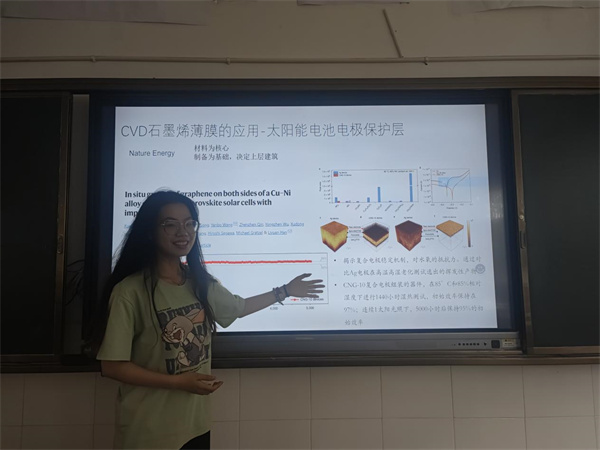 2022级物理学专业本科生龙媛媛介绍了杨长教授团队透明导电薄膜材料的科研成果;2022级物理学专业本科生沈几贝在表面张力吹泡泡实验后,探讨保秦烨教授团队在钙钛矿太阳能电池方面的研究成果;2023级理论物理专业博士研究生刘益秀展示了宋也男副研究员团队在石墨烯薄膜制备方面的科研进展;2021级物理学专业本科生何紫瑜剖析了胡炳文教授团队在锂电池方面的研究及其科学原理。
