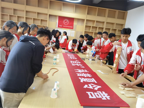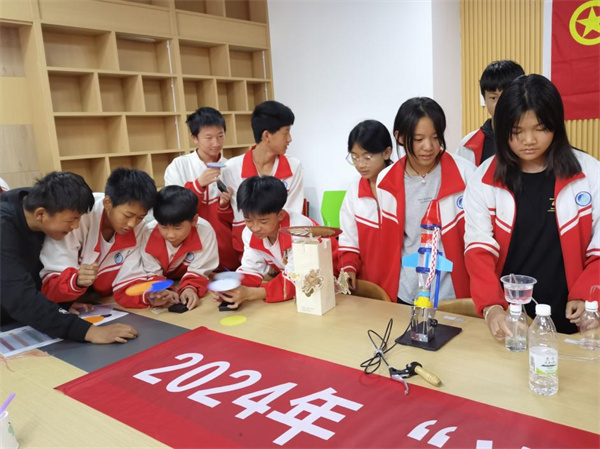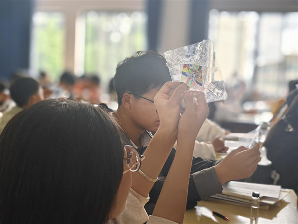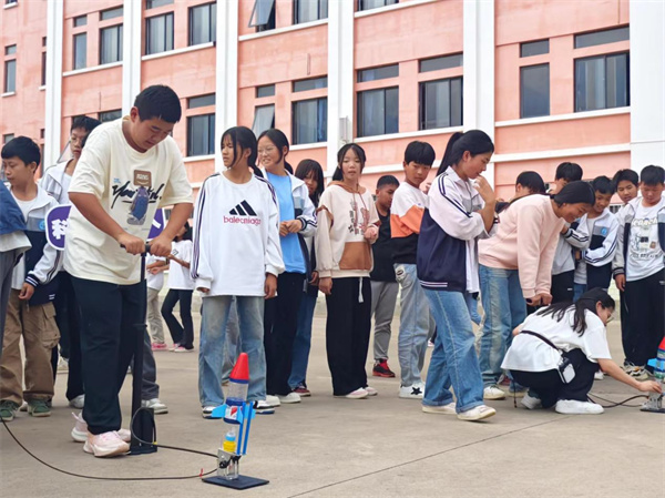 宣讲团在师宗县第二中学举办了科普作品互动展和临时科普站,精心挑选实践过程中学生实验作品,当地学生在宣讲团指导下自主搭建组成。从神奇的电磁现象展示,到精巧的光学实验装置,每一件作品都充满了趣味性和教育性,同学们热情高涨,纷纷驻足在展品前,或认真观察,或动手操作,或与宣讲团的成员交流讨论,现场气氛异常活跃。