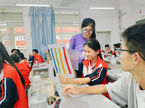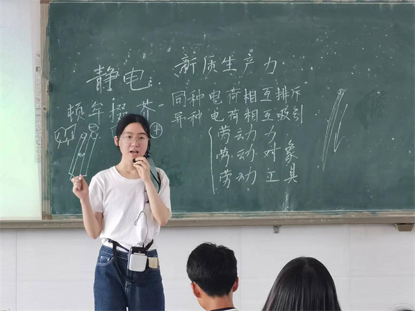 宣讲团成员根据实际状况,不断调整教学方案,改善教学设备,优化实验流程,力求以最合适的方式传授科学知识。科普课程包含力、热、光、电等,涉及潜艇模型制作、静电章鱼等十几种实验。授课过程中,宣讲团成员将科普知识传授与解读新质生产力紧密结合,为学生们展示了“墨子号”量子科学试验卫星、风力发电、静电纺丝等驱动新质生产力发展的科技成果。
