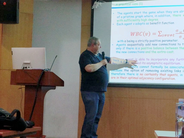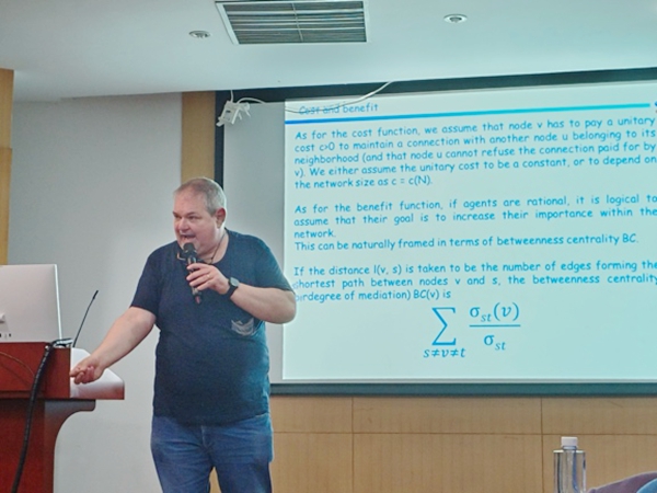 在报告中,Boccaletti教授以社会网络现象“六度分隔”为切入点,从博弈论视角阐释了“超小世界”网络结构的形成机制。他指出,尽管现实社交网络节点数庞大,但网络中的任意两节点之间的平均距离却异常短,这种现象正是“超小世界”特性的体现。通过构建演化博弈模型,Boccaletti教授论证了网络个体在提升中心性与减少连接成本之间的博弈过程,揭示出长期演化中网络结构自发趋向“成本最小化-中心性最优化”的规律。这一理论突破不仅深化了社会网络自组织机制认知,更为复杂系统协作演化研究提供了全新范式。