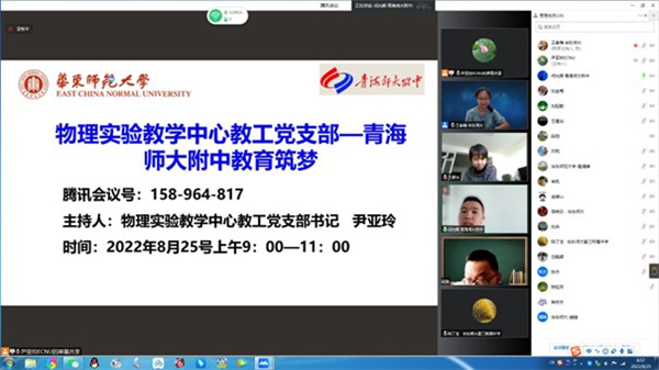 自2021年3月起,物理实验教学中心教工党支部牵手青海师大附中物理备课组,开启“教育筑梦”计划已有一年有余。一年多来,物理实验教学中心教工党支部立足中心教育资源优势,从对方的实际教学需求出发,积极组织开展云参观实验室、仿真实验授课、物理教学研讨等形式多样的交流活动,不仅与青海师大附中师生建立了深厚的友谊,也为其物理教育教学源源不断地贡献着“师大力量”。