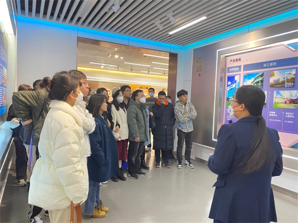 师生一同参观了华虹集团展示中心,上海华力起步于2010年,隶属于华虹集团。在讲解员的带领下,从创业布局、壮大升级、新征程等展板了解了华虹集团的起源与发展;从产业基地、业务布局、技术起步和人才建设等内容深入体会“芯”路历程;从促进科技和经济发展、承担企业社会责任、智能家居等介绍中了解华虹的工艺技术和产品应用,及其对整个产业链发展的贡献,以及华虹集团对社会所做的贡献。