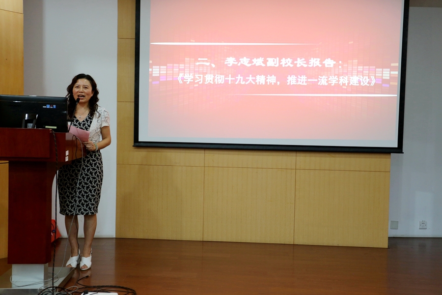 李志斌副校长随后为全院教职工深度解读了学校一流大学的建设方案和学校第十三次党代会的主要精神,他指出该方案以人才培养、科学研究、社会服务、文化传承创新、社会交流服务等方面为主要内容,以2020-2030-2050三个时间段,分三步走,实现双一流建设。同时方案也制定教育教学创新引领工程、学科科研优化提升工程、国家战略精准对接工程三大实施工程,和教育+、生态+、智能+、国际+、健康+五大行动计划。同时也提出了深化人事制度改革、推进人才队伍建设、打造担当干部队伍、提升服务管理效能等一系列保障措施。最终通过一流大学建设实现师生与学校共发展、教师与学生同成长的总体目标,为“建教育强国”和“以教育强国”的光荣事业作出新的更大贡献。