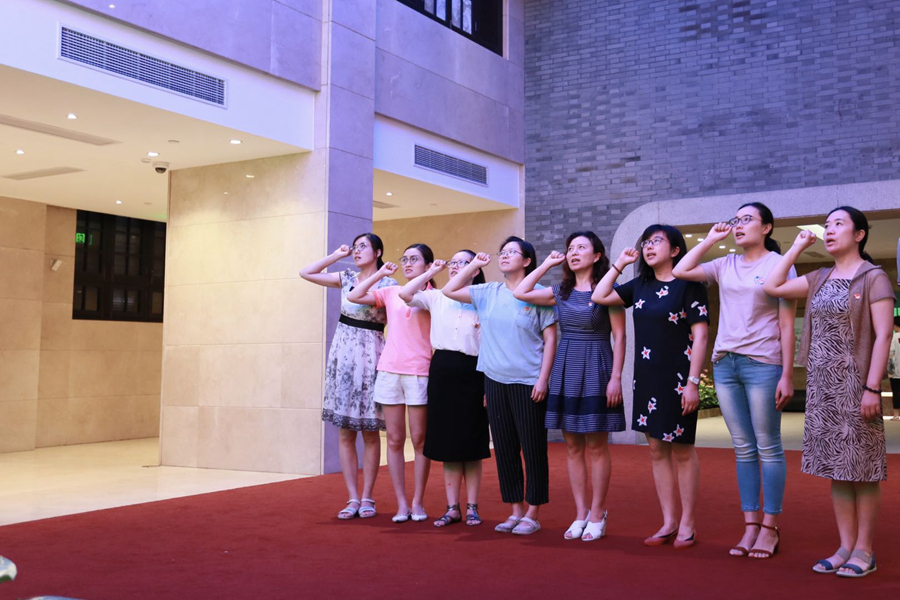 站在寓意“在中共民主革命纲领大旗指引下,工人、农民、青年、妇女运动蓬勃发展”的群像雕塑前,在鲜艳的党旗下,行政党支部全体党员在党支部书记黄蕊的领誓下重温入党誓词。面对党旗,大家举起右拳,庄严宣誓:“拥护党的纲领,遵守党的章程,履行党员义务,执行党的决定,严守党的纪律,保守党的秘密,对党忠诚,积极工作,为共产主义奋斗终身,随时准备为党和人民牺牲一切,永不叛党。”