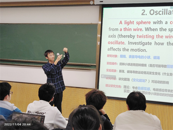 活动现场,老队员杨敬、王莘竹、沙瑞程、施维佳、王鉴纯、孙金晶、王明逍、韩孝政、罗家丽、匡砚斌等分享了训练与比赛中的心得,鼓励新生积极参与物理学术创新训练,抓住机遇,挑战自我,加速成长。