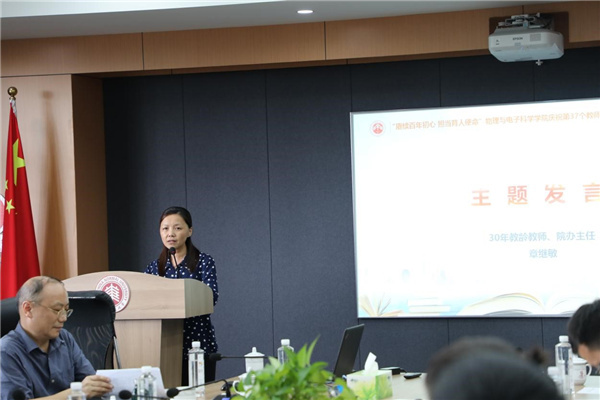 学院办公室主任、30年教龄教师章继敏即将荣休,她谈到,物理系的老教授们给了自己很多建议和帮助,尤其在担任乔登江院士秘书期间,更是学到了老一辈共产党人为科研事业奋斗一生的敬业精神,这也不断鼓舞和激励着自己。作为管理人员,要为教学科研工作做好强有力的支撑,要主动用新思想武装头脑,在学习中不断成长,树立良好的服务窗口形象。