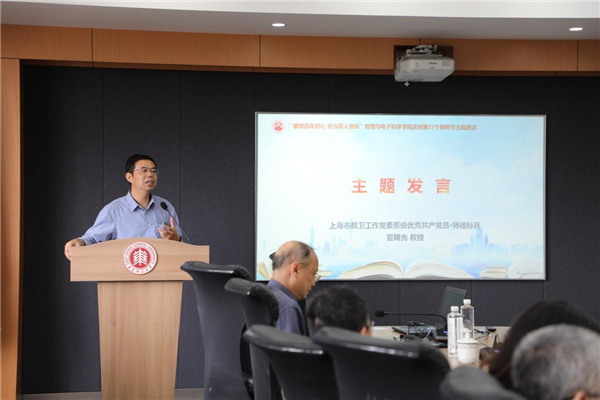 上海市教卫工作党委系统“优秀共产党员·师德标兵”管曙光结合学习“习近平总书记给全国高校黄大年式教师团队代表重要回信”精神作主题发言,他谈到,“做好老师是每一位教师应该认真思考和探索的问题,也是每一位教师的理想和追求”。青年教师要在“站稳讲台”的基础上,思考如何以德立身、以德立学、以德施教,通过自己的一言一行把对教学的热爱、对学生的关爱传递出去,潜移默化地教育和影响学生,真正做到“学为人师、行为世范”。