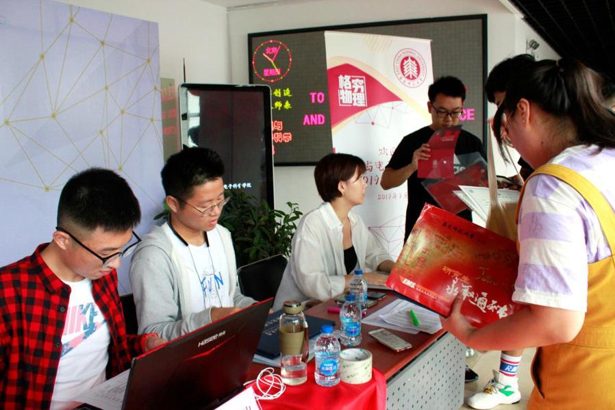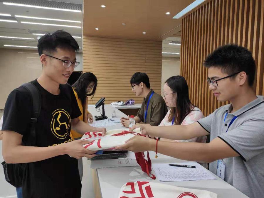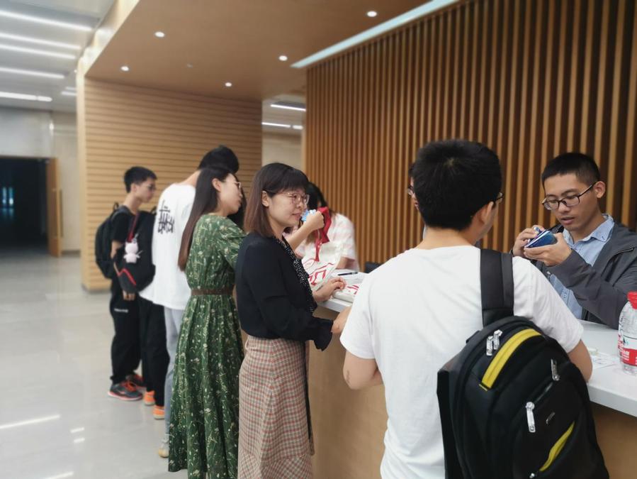 在物理楼迎新工作点,迎新师生耐心细致地指导2019级新同学办理入学手续。志愿者们依次核查新生身份信息等相关证件,为新生发放《研究生手册》、校园卡等材料,并及时完善班级通讯录、建立微信通知群等。同时,学院党委在迎新工作点设置党员服务岗,亮明身份,积极参与迎新,发挥模范表率作用。