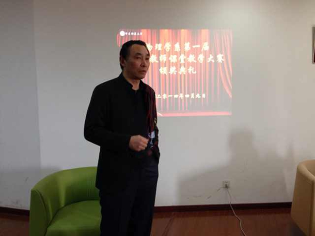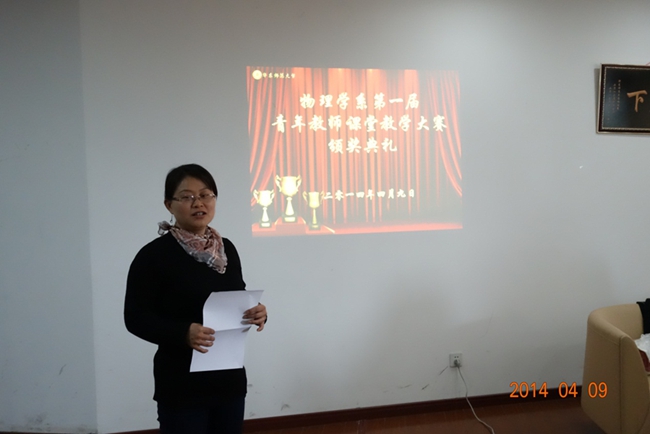 颁奖典礼首先由本次赛事的发起人,物理学系副主任王向晖老师致辞开始,她详细介绍了本次青年教师课堂教学大赛的具体情况。物理学系青年教师课堂教学大赛是为进一步激发和鼓励我系青年教师投身物理基础教学,提升教学水平,推动教学内容和方法的改革,增进教学经验,提高人才培养质量而特别举办。整个比赛内容涵盖所有物理学系开设的课程,对所有参赛青年教师采取随堂拍摄,并由教学委员会委员随机听课展开评定。所有录制视频,经物理学系教学委员会严格审查,从教学仪态、课件设计、多媒体运用,及课堂气氛等多方面对参赛青年教师进行了审慎打分。比赛自2014年3月启动至今,经过为期1个多月的紧张筹备、拍摄和评比,最终从18位参赛青年教师中评定出了一等奖2名、二等奖4名、三等奖5名、优秀奖7名。(获奖名单见附录)