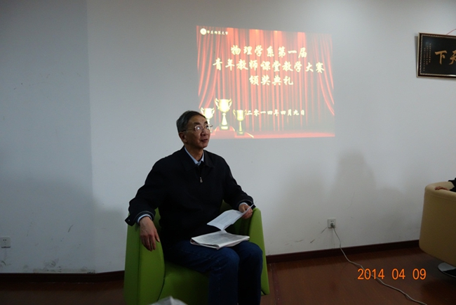 2014年4月9日中午12:00,物理学系第一届青年教师课堂教学大赛颁奖典礼于物理楼227活动室拉开帷幕。物理学系党委书记马学鸣,系副主任王向晖、徐敏,副书记马红梅,工会主席姜继森等老师,以及校教学督导、原物理学系教授朱鋐雄、宦强等老师莅临参与并颁奖。