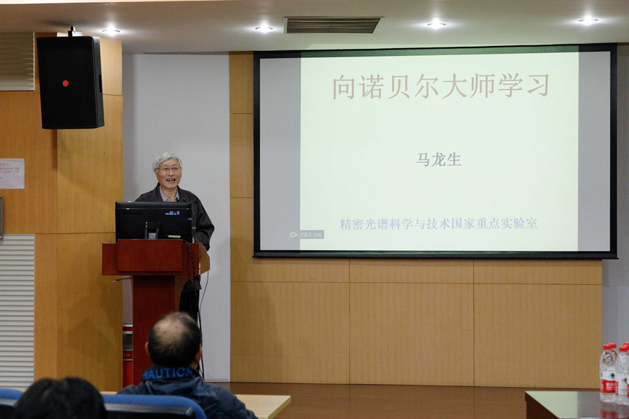 12月20日(周三)下午,精密光谱科学与技术国家重点实验室马龙生教授赴我校闵行校区物理楼226报告厅,面向16、17级物理菁英班本科生做其精心准备了一年的,题为“像诺贝尔大师学习”的专题讲座。讲座由我院周先荣副院长和董光炯教授主持。