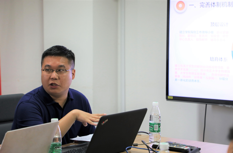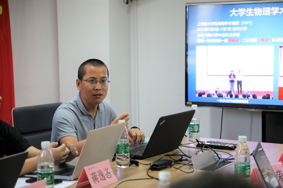 学院双创工作联络人、CUPT(大学生物理学术竞赛)指导教师张杰结合我院师生参加2019年CUPT的备赛参赛过程进行汇报。他从我院在历年CUPT赛事中的获奖情况、参赛队伍的组建、学生的训练模式几方面,介绍了我院在推进学生参与学科竞赛中的特色做法,并用“勤学苦练”“强字当先”强调了参赛师生投入度的重要作用。