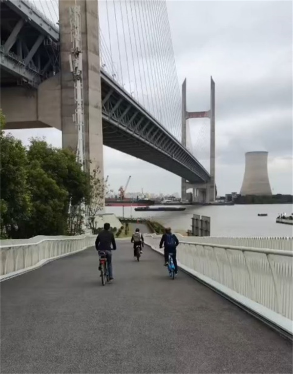 随后,教职工登船横渡黄浦江。在杜行渡口下船后,沿着黄浦江东岸绵延的林荫小道,一路向南骑行。沿途坐落着不少村落,环境优美安详。沿着江堤骑行,一路江风拂面,凉爽宜人,一行人谈笑风生,身心愉悦放松。